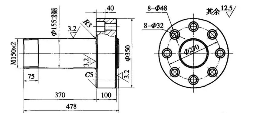 銘澤機(jī)械廠家建議液壓機(jī)設(shè)備客戶在主缸活塞桿斷開處鑲一段桿接手(圖2),桿接手一端制成與活塞桿同直徑的圓盤,并制均布螺栓沉孔,以便用數(shù)個(gè)高強(qiáng)內(nèi)六角螺栓與主缸活塞桿連接,端部有承接的凸臺(tái)與活塞桿桿頭修理處相對(duì)應(yīng),另一端仍制成與斷掉的桿段相同的與滑塊孔配合軸段和緊固雙螺母螺紋段。