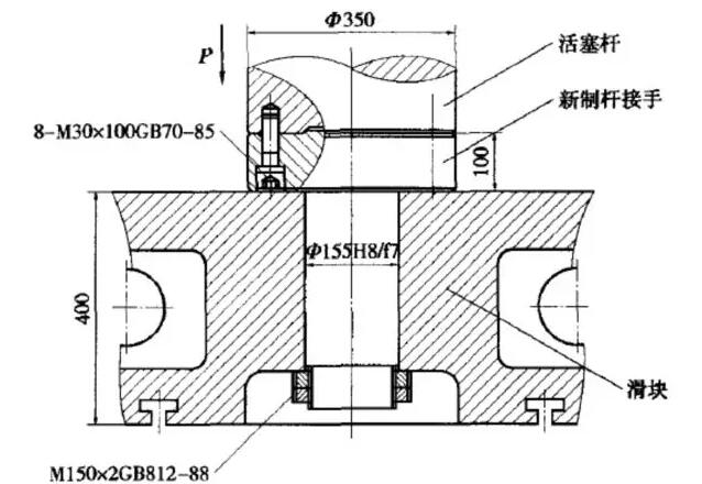 而其維修與修理過程詳細(xì)如下:拆除液壓機(jī)設(shè)備上的主缸活塞,將主缸活塞桿斷口處車平,并加工出與桿接手配合的止口,再加工均布的M30螺紋孔。按圖2制作桿接手。用M30高強(qiáng)內(nèi)六角螺栓將桿接手與活塞桿緊固在一體。將主缸和上橫梁垂直吊起,套入四個(gè)立柱之上,把上下立柱鎖緊螺母擰在立柱上,下鎖緊螺母應(yīng)充分緊固,上鎖緊螺母則應(yīng)稍留間隙備調(diào)整精度時(shí)用。充液桶安裝、加油,使主缸全行程動(dòng)作數(shù)次,將油缸和管路內(nèi)空氣排除干凈。主缸活塞下行至與滑塊上平面相接觸后,用雙螺母固定(圖3)。滑塊與主缸活塞緊固聯(lián)結(jié)后,按規(guī)定精度調(diào)整,將立柱鎖緊螺母盡量緊固。進(jìn)行負(fù)荷試車。在滑塊側(cè)面醒目位置上設(shè)警示標(biāo)牌,標(biāo)“不得超過最大偏心距使用,嚴(yán)禁超過滑塊的最大行程使用”。當(dāng)修復(fù)后液壓機(jī)設(shè)備的開口高度由1200mm減小為1100mm,但仍可滿足工藝裝備要求。