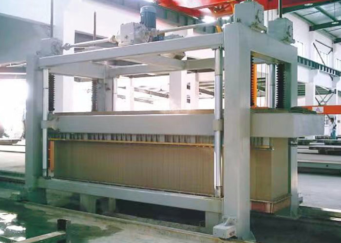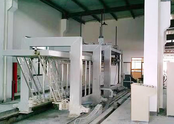 工作原理: 翻轉吊具把模具帶坯體一起空中翻轉90度置切割小車上,脫模把坯體連同側板留在切割小車上,切割小車由電機作動力行走,通過縱切裝置完成縱向切割、銑槽、水平切割;切割小車繼續行走至橫切裝置中央位置停止后,橫切裝置啟動,橫切架自上而下垂直下切完成橫向切割;切割小車再行走至編組吊具處由編組吊具將坯體(連側板)吊至蒸養小車上,切割小車返回原始位置進行下一個切割循環。 主要特點: ⑴、 機型結構精簡實用,便于安裝維修; ⑵、 坯體側立放置使坯體寬度為600mm,高度為1200mm,切割鋼絲短,不易拉斷,不易飄移,切割精度高; ⑶、 縱向切割裝置固定,切割小車行走完成縱向切割,切割時間短。橫切裝置采用鋼絲水平下切,縮短切割鋼絲長度,保證切割精度; ⑷、 坯體側立后可縱向切割時完成銑槽,不需另配槽口加工設備; ⑸、 本機型對坯體作六面切割,制品質量不受模油及模具變形影響; ⑹、 本機型除生產砌塊外還可生產板材; ⑺、 機型切割過程(翻轉、縱切、橫切)分不同工位完成,各工位工作簡化,操作保養方便。